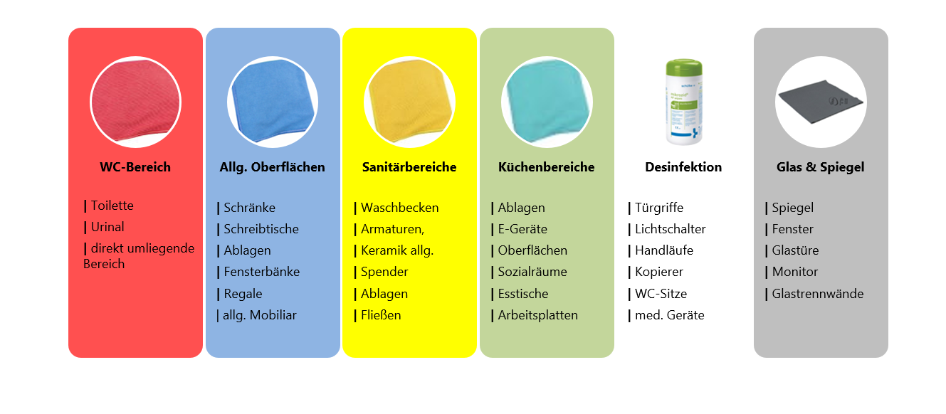 „Um eine hygienisch einwandfreie Reinigung und die Vermeidung von Kreuzkontaminationen sicherzustellen, arbeiten wir nach einem klar strukturierten Farbsystem für Reinigungstücher. Jede Farbe steht für einen bestimmten Einsatzbereich. Diese systematische Trennung gewährleistet nicht nur höchste Sauberkeit, sondern auch die Einhaltung aller geltenden Hygienestandards – für ein sicheres und gesundes Umfeld in allen betreuten Objekten.“